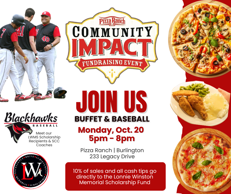 OCT. 20, 2025: Burlington Pizza Ranch Community Impact Fundraising Event 5p-8p. JOIN US as we feed the future of SCC Baseball Players one plate at a time! 10% of buffet sales and all cash tips will be donated to the LWMS scholarship fund.